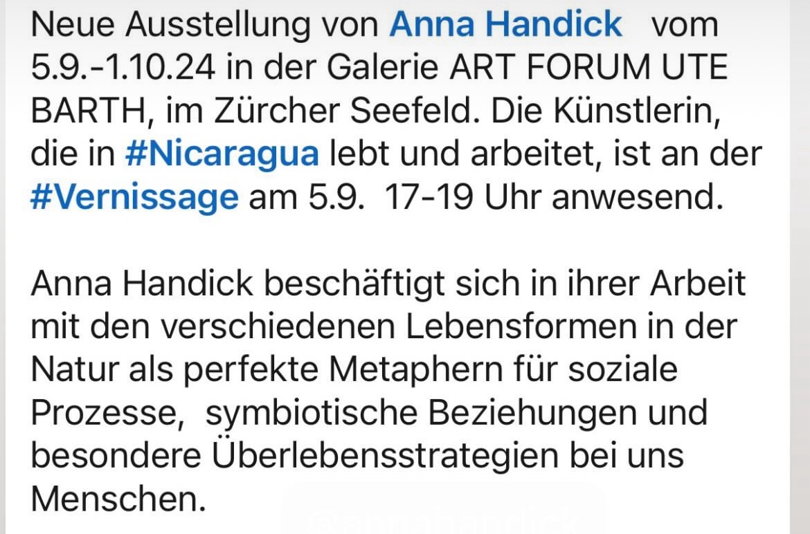Sie hat die Meisterklasse von Claus Bury an der Nürnberger Kunstakademie absolviert. In Zeichnungen und Installationen beschäftigt sie sich mit unentdeckten Lebensformen, Augenblickaufnahmen aus der Zukunft, mit von Menschen geschaffenen Räumen und Strukturen, wenn die Menschen sie schon längst vergessen haben. Mit natürlich wirkenden Materialien wie Hanf und Pappmaché kreiert Anna Handick organische Formen, die gerade durch ihre nicht perfekte Beschaffenheit an verlassene Nester, Behausungen von Insektenschwärmen und exotische Pflanzen erinnern. Die unregelmässigen Oberflächen, die gedämpften Farben, der Geruch des Hanfs sowie das leichte Schaukeln der von der Decke herabhängenden Installationen regen die Phantasie an und lassen im Betrachter die Frage entstehen, wer oder was diese Hüllen und Behausungen wohl soeben verlassen hat. Unbewusst hält der Betrachter beständig Ausschau nach den Bewohnern der Skulpturen. Diese werden jedoch nie sichtbar.