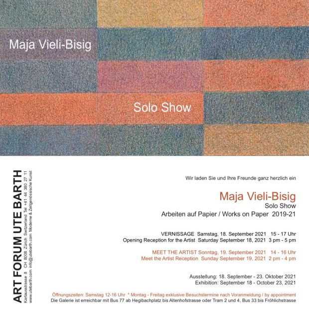Maja Vieli-Bisig ist nicht nur Künstlerin sondern auch Musikerin. So entstehen ihre Werke mit dem Wissen um die Nähe von Farbklang und Klangfarbe, und sie hat sich ganz bewusst für ein System entschieden, das die hörbaren Schwingungen in einen sichtbaren Bereich transferiert. Sie schichtet die jeweiligen Farben der Obertöne und des Grundtones lasierend übereinander.So wird den Bildern bei genauerer und intensiverer Betrachtung Tiefe und Raum verliehen, manchmal verstärkt durch verschiedene Strukturen. Seit Beginn ihrer künstlerischen Laufbahn hat sich Maja Vieli-Bisig mit Akkorden, Intervallen und Tonreihen auseinandergesetzt, aber auch mit dem Reichtum, der Vielschichtigkeit jedes einzelnen Tones, den dieser durch seine Obertonreihe gewinnt, die dann wiederum mit der Farbe des Grundtons überdeckt wird, der ja auch in der Musik das Hauptgewicht ausmacht und das Werk als in sich ruhende Einheit abschliesst.